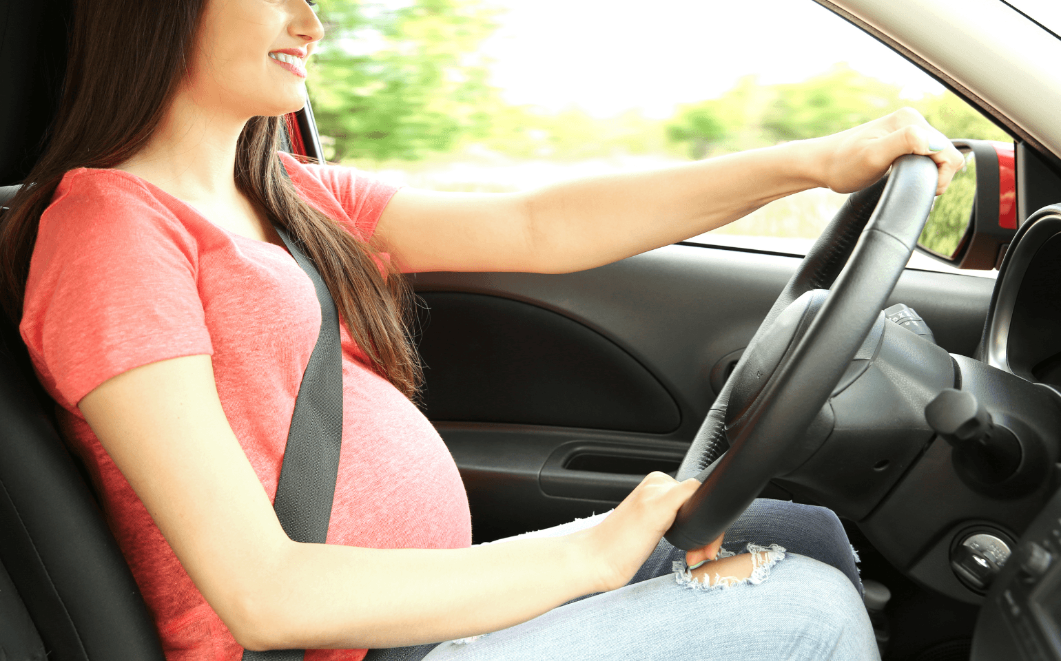 安全ベルトは緩めず、下腹部を避けて腰骨の位置で締めると負担が少なくなります。